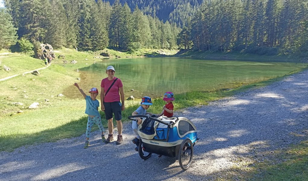 Naše výletní trasa tentokrát vypadá na mapě dost zmatečně, protože jsme měli sebou cyklovozík a dost často jsme museli přizpůsobovat cestu tak, aby se tam dalo s vozíkem jet. Někde jsme se i rozdělili. Ke Grünersee se určitě plánujeme vrátit, ale tentokrát už bez vozíku, ať si to tam víc užijeme. Ten den, kdy jsme tam byli, tak tam bylo na místní poměry fakt celkem hodně lidí, ale asi to bylo tím, že to byl první hezký den po deštivém období.