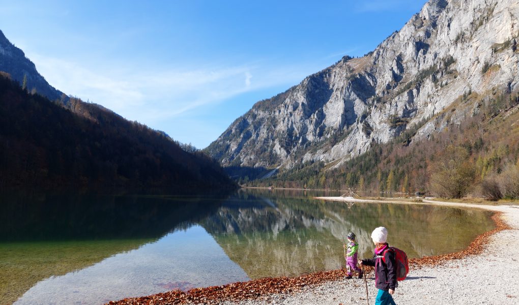 Jezero Leopoldsteiner See se nachází kousek za městem Eisenerz, cca 20 minut autem od Vordernbergu. Jezero je celkem dost hluboké a nikdy nezamrzá. Vždycky (i v zimě) jsou na něm k vidění labutě. Má 2 parkoviště – spodní bývá většinou téměř plné, ale vždycky se nám podařilo zaparkovat tam. Vrchní parkoviště je volnější. Platí se tam na obou parkovištích parkovné (cca 2 eura na půldne). My ho většinou neplatíme, protože se často vyhrabeme na výlet až kolem oběda, když už lidi, co přijeli dřív, jdou z výletu domů, a často se nám stává, že k nám někdo takový přijde a dá nám svůj ještě platný lístek, ještě než se vůbec stihneme dohrabat k automatu. Na parkovišti jsou záchody a kavárna. Na druhé straně u pláže jsou taky záchody a občerstvení. V létě se v jezeře dá koupat. Je tam i půjčovna lodiček/šlapadel. Procházka kolem jezera je pěkná. Za hezkých víkendových dní tam ale může být celkem narváno. Strana naproti parkovišti je hezčí, jsou tam pěkné výhledy a celkem dost laviček. Cesta je ale také členitější, jsou tam kořeny, někdy je úzká. Jako projeli jsme to i s naším cyklovozíkem, ale úplně na pohodu to nebylo. Na kočárek je vhodnější cesta na straně u parkoviště. My to obvykle chodíme jako kolečko.