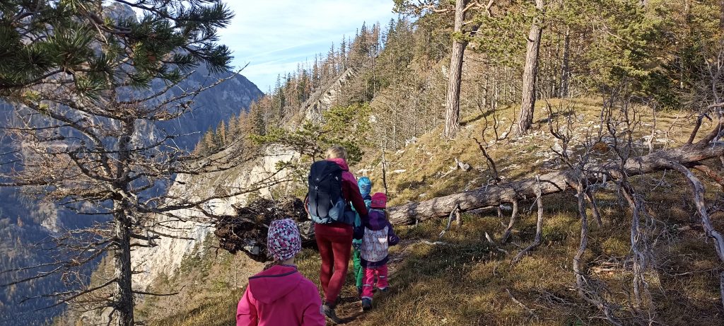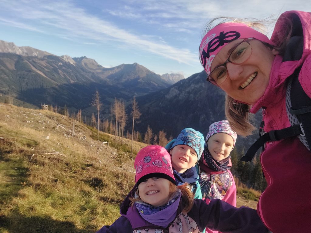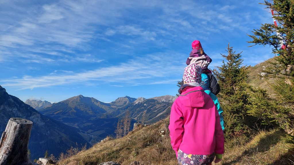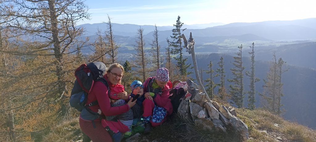 Klammkogel je jedním z kopců přímo ve Vordernbergu. Je tedy možné na něj vyrazit i pěšky bez přiblížení autem. My se tam vypravili s dětma a babičkou, takže jsme se autem přiblížili. Parkovat se dá na mapě v bodě 1, běžně tam parkuje několik aut. Petr nás odvezl až do bodu 2, kam se ještě dá dojet, ale nedá se tam parkovat. Tam nás vyložil a vrátil se zaparkovat dolů (potom si auto šel nakonec zase sám vyzvednout). Cesta do kopečka je sice hodně náročná, je tu velké převýšení na malé trase a jde se po malé hodně členité cestě, ale děti celkem bavila. Výhledy tady jsou super. Ještě před vrcholem je jeden menší kříž, nahoře je klasický vrcholový. Úplně bych asi nedoporučovala tuhle trasu chodit za mokra. Cesta dolů, kterou jsme si vybrali, je velká široká cesta. Po ní by se na vrchol klidně dalo dojet i s kočárkem, ale malá cestička je nahoru větší zážitek.