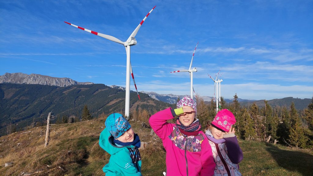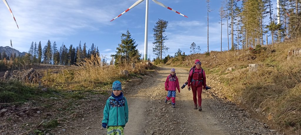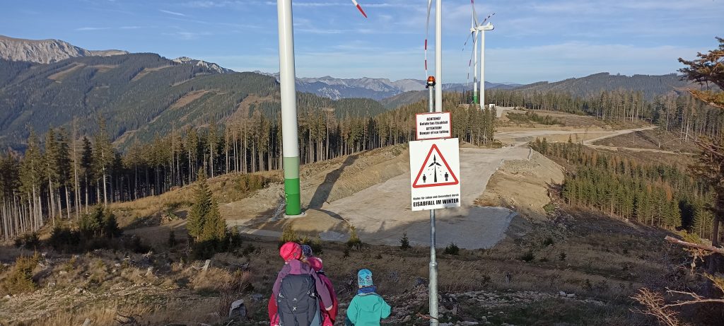 Nedávno jsme se na Klammkogel vydali znovu, tentokrát trochu jinou cestou. Novinkou jsou v bodě 3 čtyři větrné elektrárny. Při naší návštěvě ještě nestál, ale nově tam je na předvrcholu Klammkogelu, který se jmenuje Herzkogel (ale na mapě nemá jméno), moc pěkný vrcholový kříž. Pozor, kolem větrníků je všude napsáno, že v zimě tam může odlétávat kolem led.