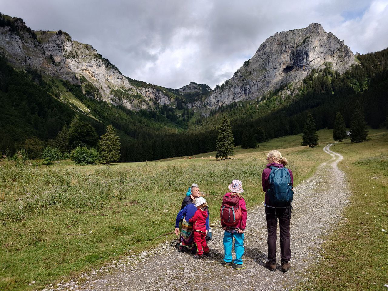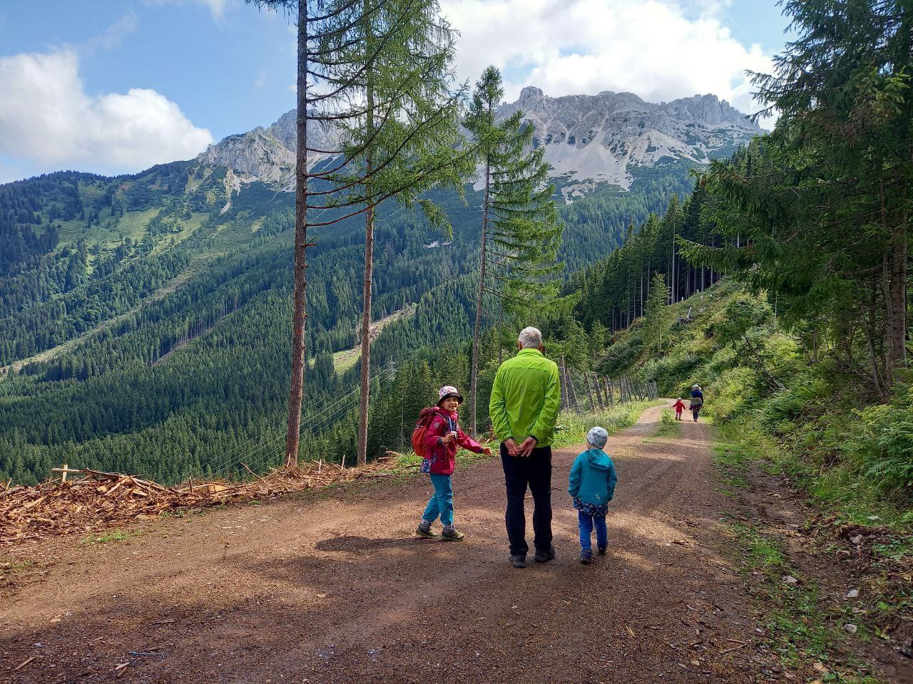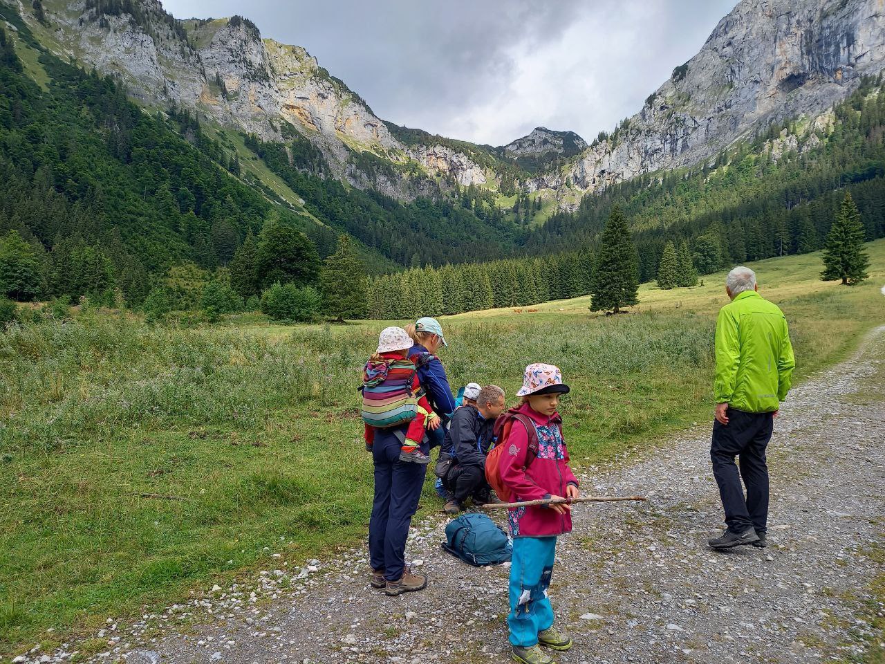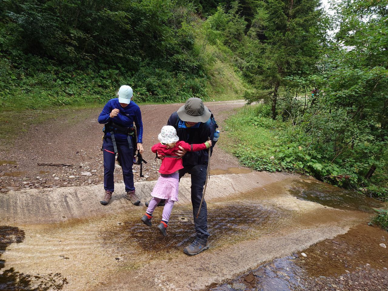 Určitě jsme udělali dobře, že jsme šli ke Gsollhütte tudy a ne spodem, protože to byla o dost zajímavější cesta. Často tu jsou pěkné výhledy a také tu jsou asi 3 brody, které měly u dětí velký úspěch. Samotná Gsollhütte byla v době naší návštěvy zrovna zavřená (všední den kolem poledne). Od chaty se dále dá ještě dojít podívat ke vstupu do Frauenmauerhöhle. To je tunelová jeskyně nasrkz horou Frauenmauer. Dříve bylo možné jeskyni projít (s průvodcem po předchozím objednání) a pokračovat v túře na druhé straně hory. Tato možnost byla ale loni z bezpečnostních důvodů zrušená a v současné době je do jeskyně zákaz vstupu.