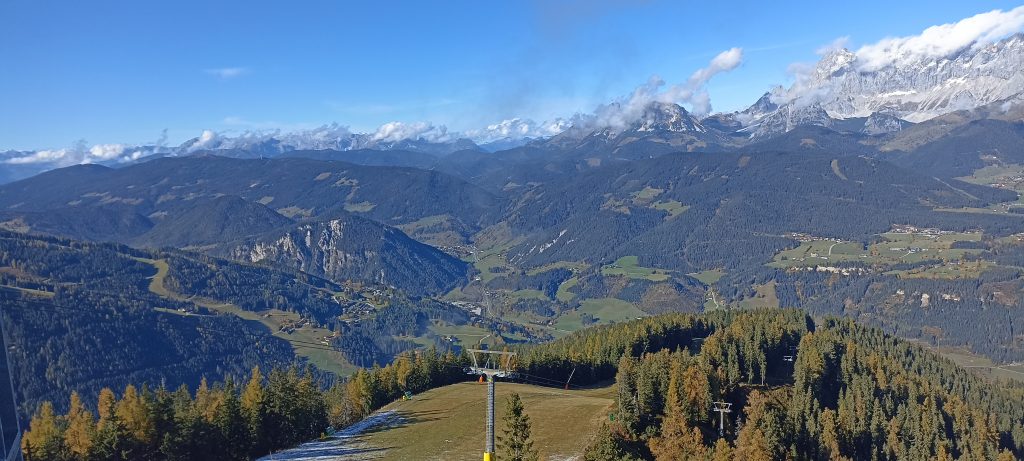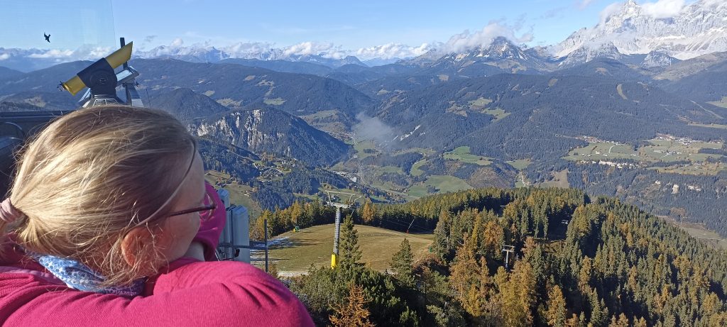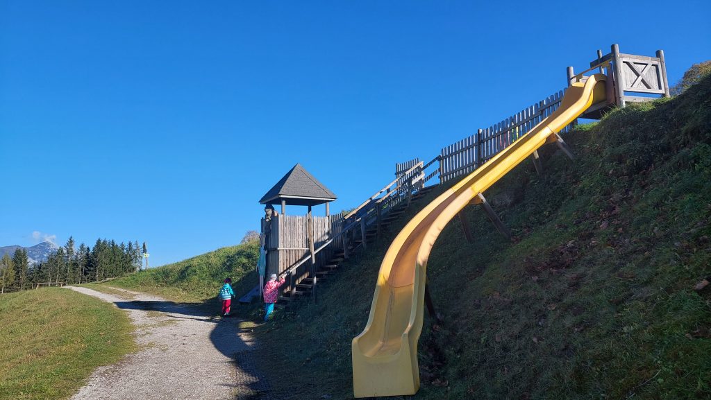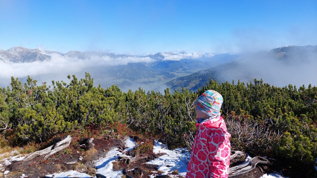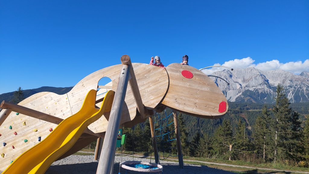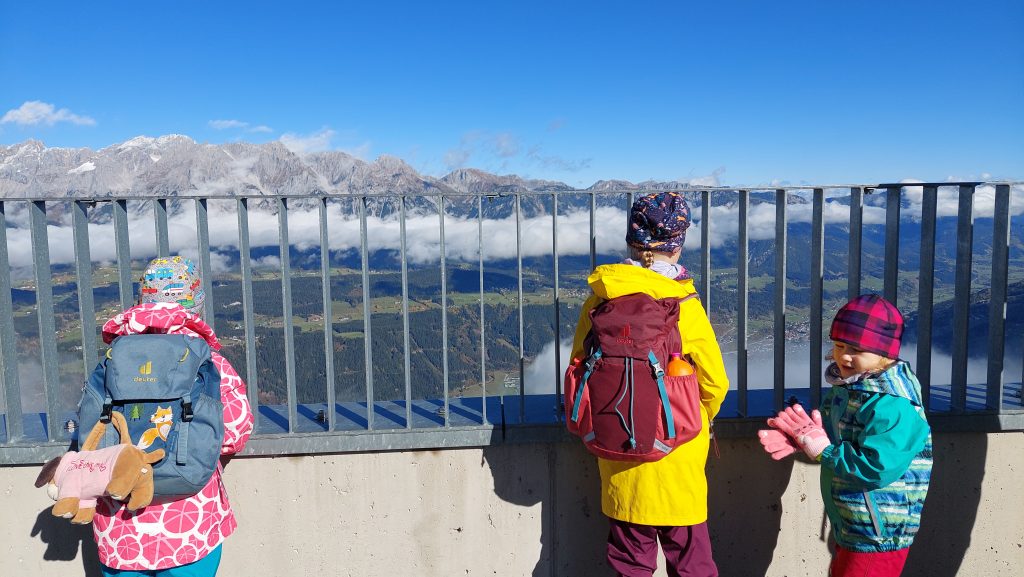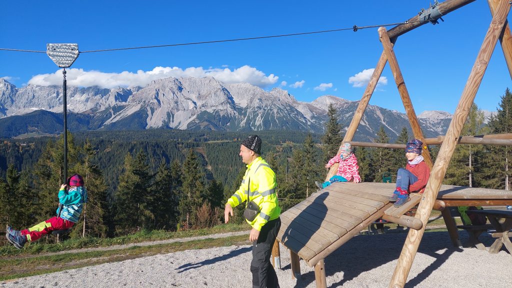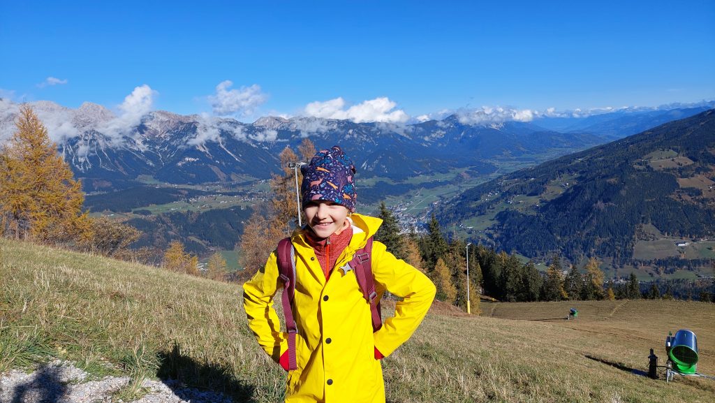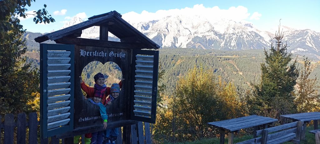 Stala se nám taková nemilá věc, kdy jsme omylem nechali dvě tašky s vrchním oblečením a náhradníma botama v bytě a zjistili to na parkovišti. Předpověď byla taková, že na vrchu měla být celkem zima a občas i sníh. Vyhrabali jsme, co jsme v autě provizorního našli (pláštěnky atd.), a když už jsme tam byli, tak jsme vyrazili kabinovou lanovkou nahoru. Naštěstí nahoře zrovna svítilo sluníčko, takže pocitová teplota nebyla zas tak špatná, ale i tak jsme radši jeli zase brzo dolů. Obešli jsme si nahoře kratší kolečko. Je tam jenom malé dětské hřiště, ale výhled je z Hochwurzenu parádní. Řekla bych, že tam je nejlepší výhled na okolní kopce, pokud človek nechce moc chodit. Kolem Schladmingu můžu srovnat Planai (spousta opičáren pro děti, ale taky velká spousta lidí), Rittisberg (menší kopec, výhled na stranu k Dachsteinu, dole bobovka, takže i hodně lidí), Hauser Kaibling (takový sympatický kopec, všude ovečky, super výhled na Dachstein, dobře rozvržená stezka pro děti) a Hochwurzen.