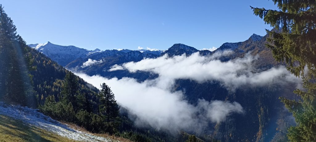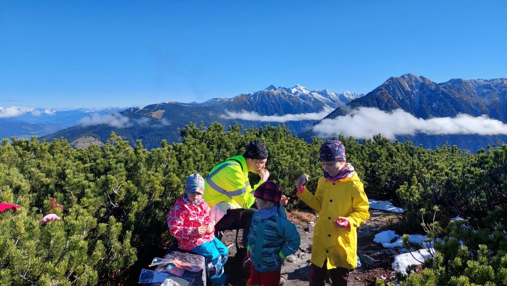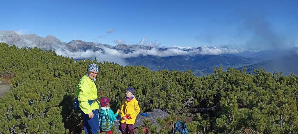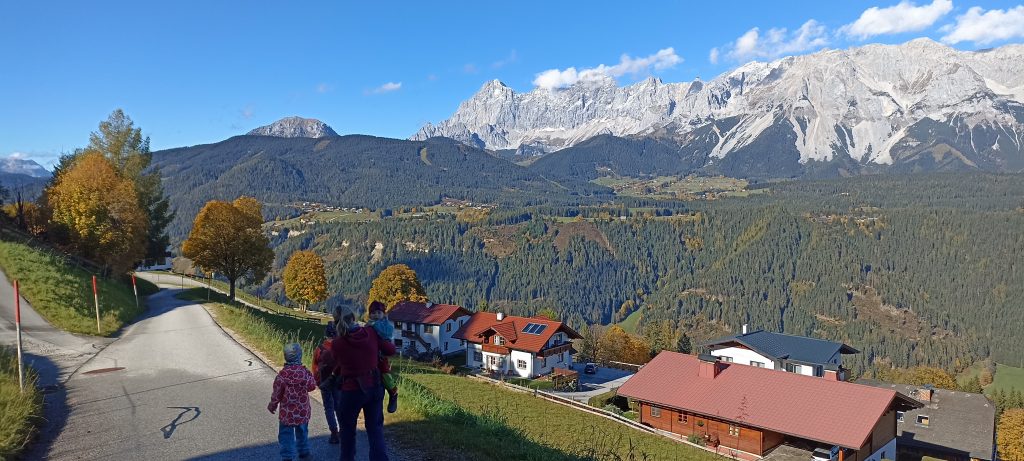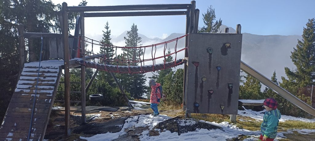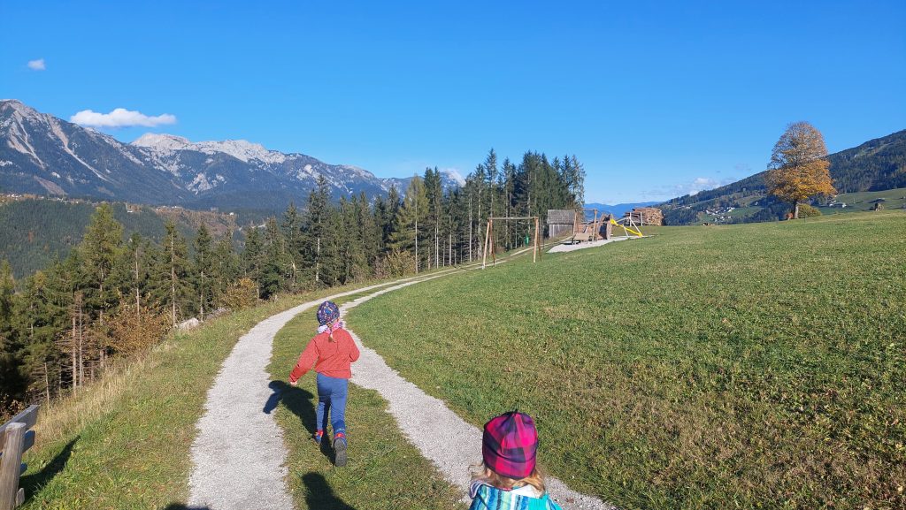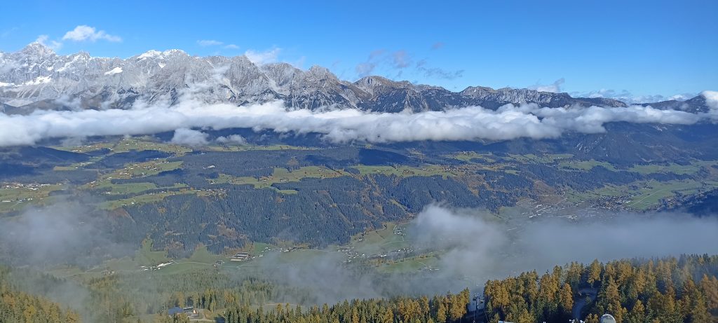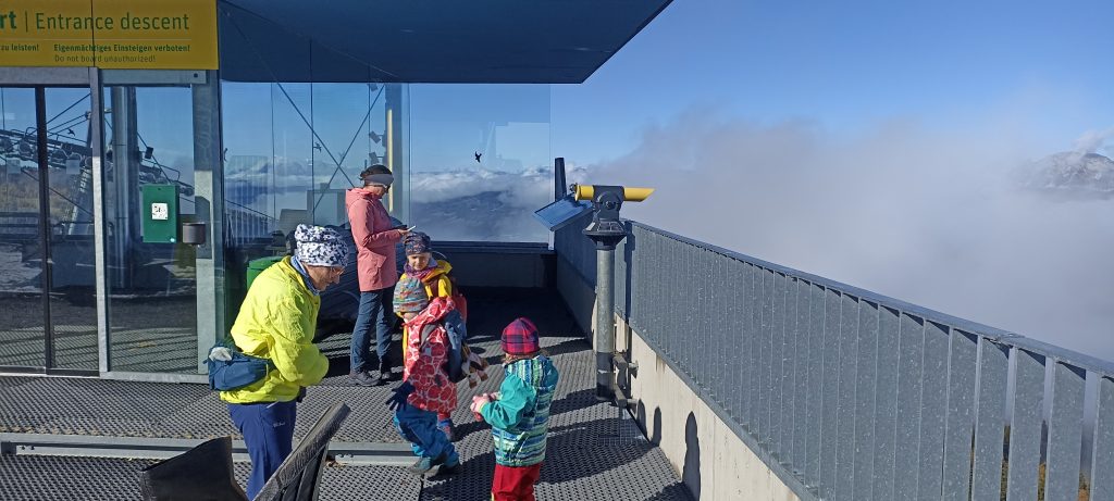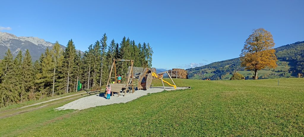 Stala se nám taková nemilá věc, kdy jsme omylem nechali dvě tašky s vrchním oblečením a náhradníma botama v bytě a zjistili to na parkovišti. Předpověď byla taková, že na vrchu měla být celkem zima a občas i sníh. Vyhrabali jsme, co jsme v autě provizorního našli (pláštěnky atd.), a když už jsme tam byli, tak jsme vyrazili kabinovou lanovkou nahoru. Naštěstí nahoře zrovna svítilo sluníčko, takže pocitová teplota nebyla zas tak špatná, ale i tak jsme radši jeli zase brzo dolů. Obešli jsme si nahoře kratší kolečko. Je tam jenom malé dětské hřiště, ale výhled je z Hochwurzenu parádní. Řekla bych, že tam je nejlepší výhled na okolní kopce, pokud človek nechce moc chodit. Kolem Schladmingu můžu srovnat Planai (spousta opičáren pro děti, ale taky velká spousta lidí), Rittisberg (menší kopec, výhled na stranu k Dachsteinu, dole bobovka, takže i hodně lidí), Hauser Kaibling (takový sympatický kopec, všude ovečky, super výhled na Dachstein, dobře rozvržená stezka pro děti) a Hochwurzen.