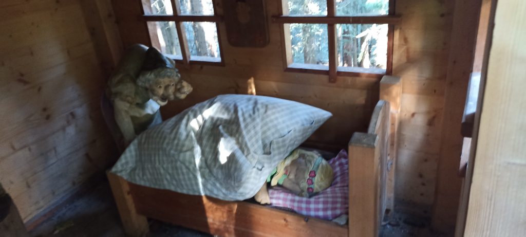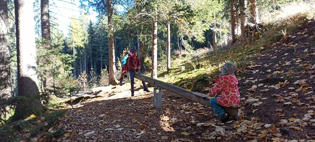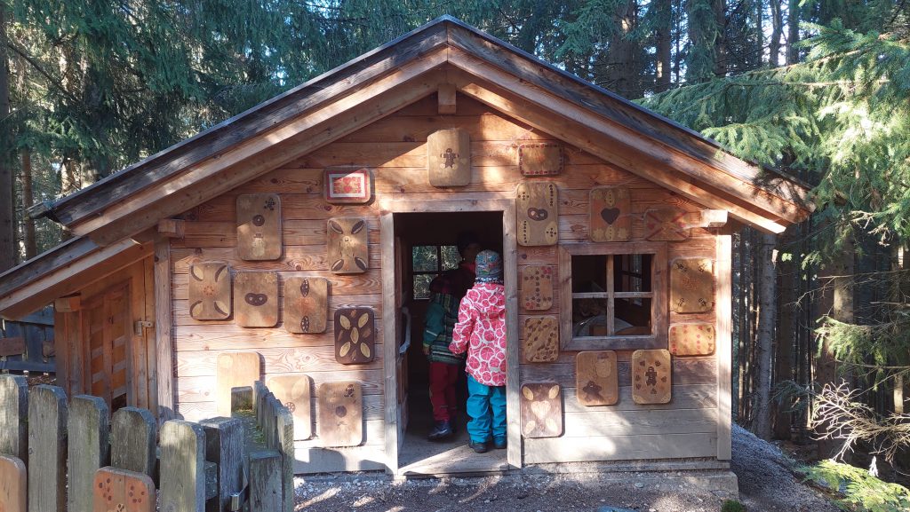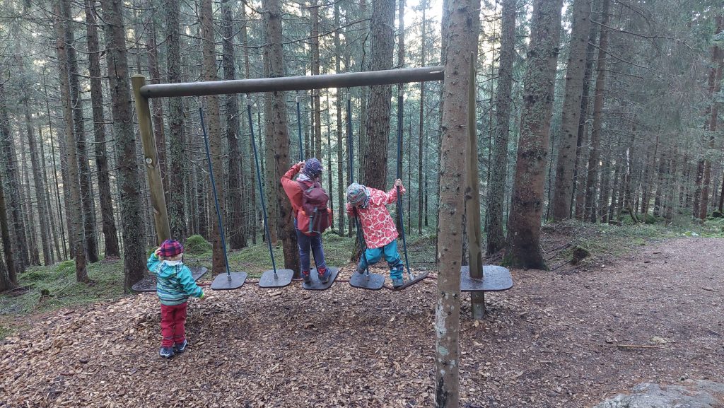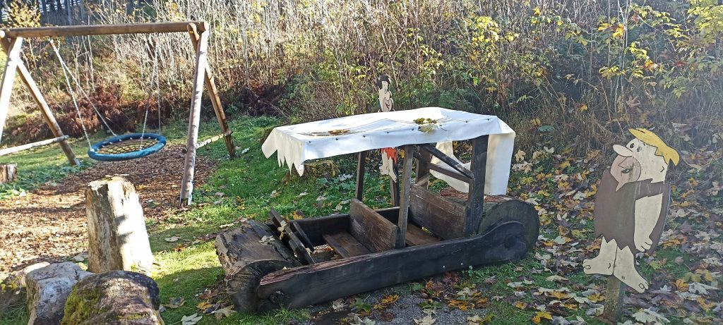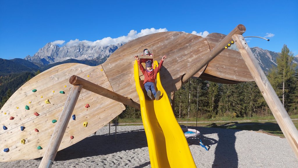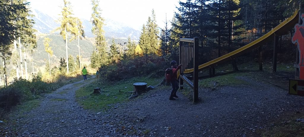 Od spodní stanice lanovky jsme se potom vydali na pohádkovou stezku Märchenweg. Stezka je zdarma. Mezi body 2 a 4 v mapě je spousta zastávek pro děti. Moc nedoporočuji chodit na stezku po dešti, jako jsme šli my, protože v lese byly všechny atrakce mokré. Zase to mělo ale výhodu v tom, že jsme tu byli téměř sami. Dětem se stezka moc líbila a hřiště na konci ve tvaru mravence s výhledem na Dachstein je fakt boží!