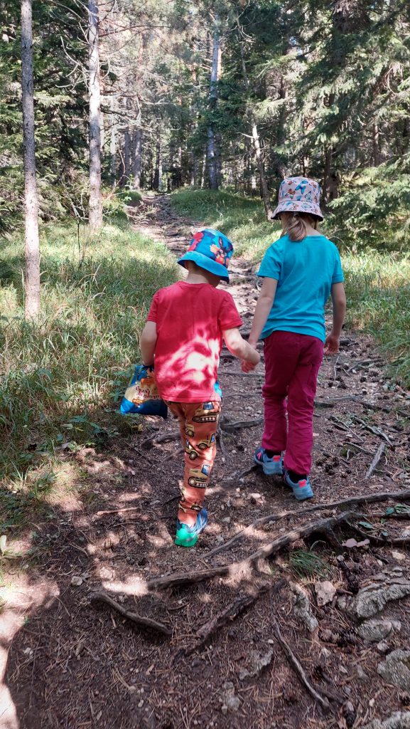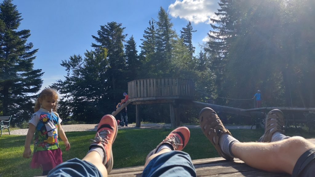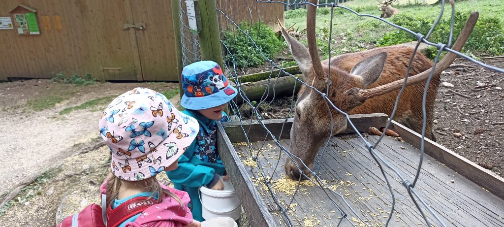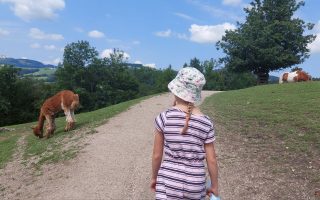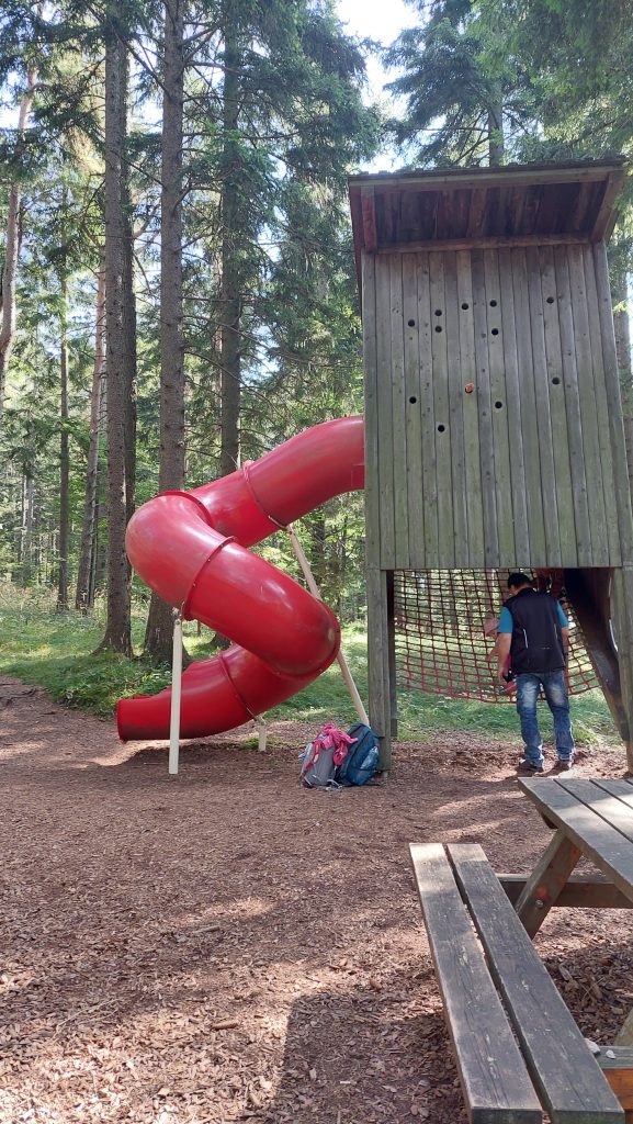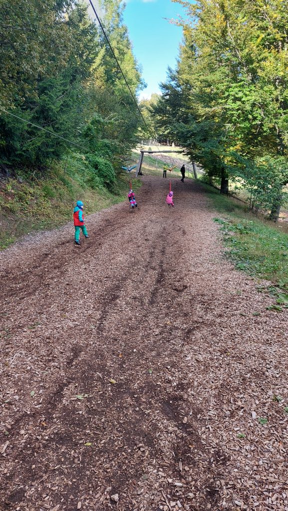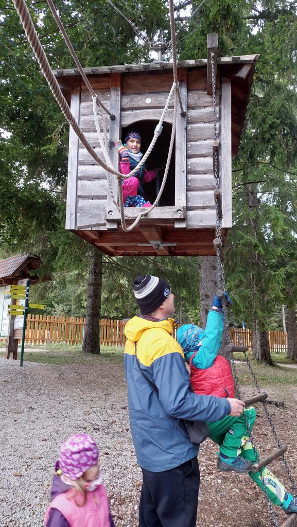 Jak jsme plánovali, tak jsme se sem po roce vrátili. Nemohli jsme vynechat jeleny. Na jejich krmení se děti moc těšily. Stavili jsme se tedy u jelenů a pak jsme šli prozkoumat druhou část se zvířaty a hřišti, co jsme minule nestihli. Pokud máte nemáte moc času spojit obě trasy dohromady, tak bych si vybrala tuto druhou (ale se zastávkou u jelenů, ti stojí za to). V této trase jsme se stavili i na rozhledně. Děti zaujalo Steinbockkino a opět několik hřišť.