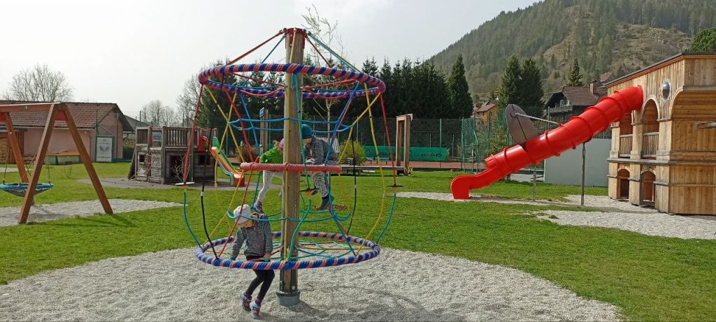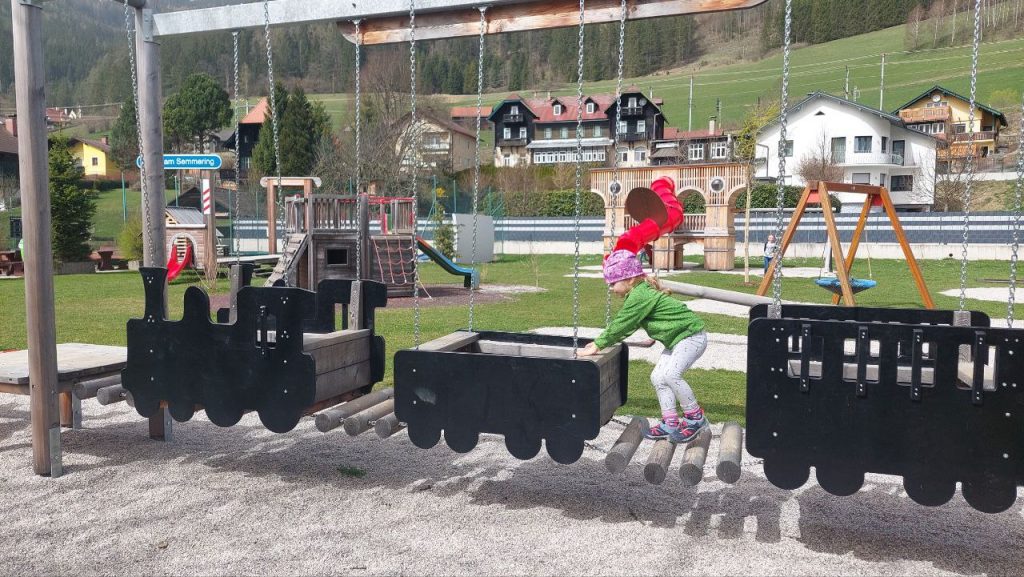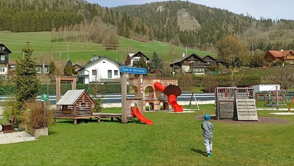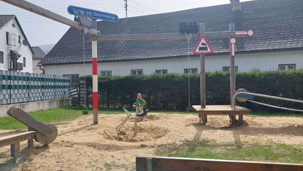 Ve Spital am Semmering asi začneme stavět častěji. Narozdíl od Semmering Kurort (to je ten „hlavní“ Semmering), to tu působí lehce zapadle a hlavně tu mají fakt bezvadné hřiště pro děti. Parkovali jsme na tom větším parkovišti u hlavní ulice, které je na mapy.cz jako pouze pro zákazníky, ale jenom část parkoviště je pro zákazníky banky a zbytek je bezplatný. Dalo by se i zaparkovat v ulici k hřišti, ale muselo by se najet ve směru od kašny. Ve směru od Vordernbergu totiž ulice nejde projet. Hřiště je nové a má znázorňovat vlakovou trať přes Semmering. Svoje si tu určitě najdou menší i větší děti. Ani jedno z našich dětí nechtělo odejít pryč.