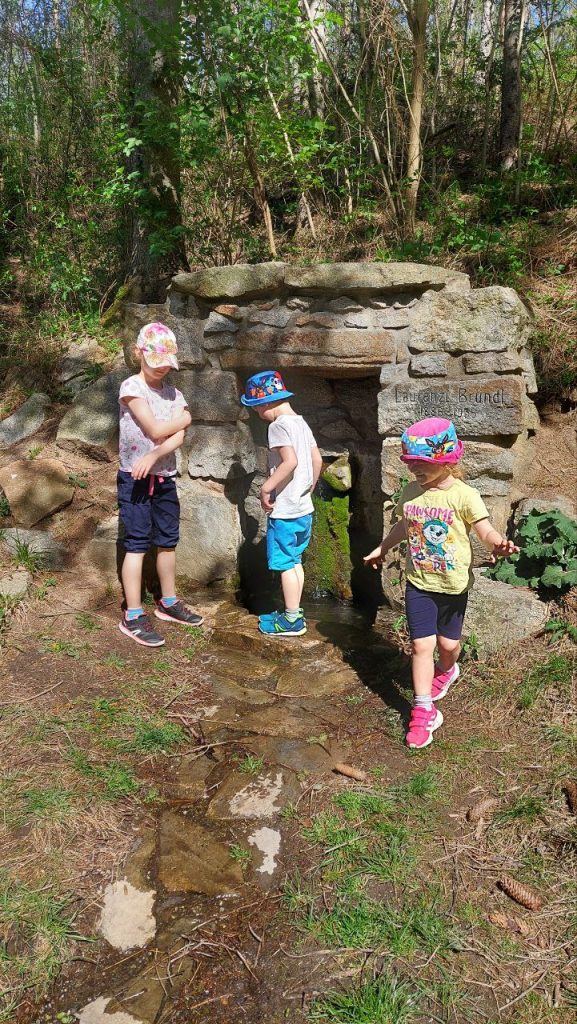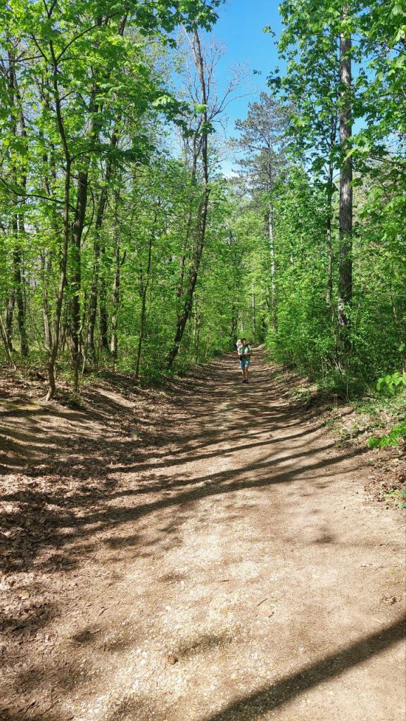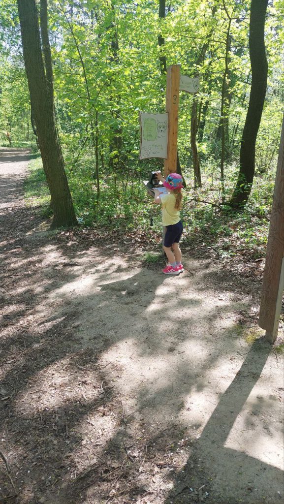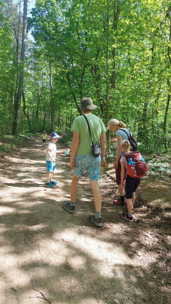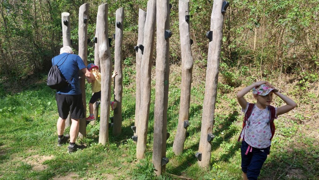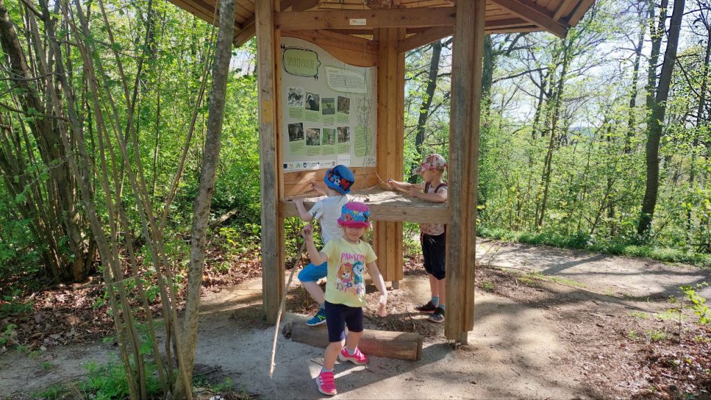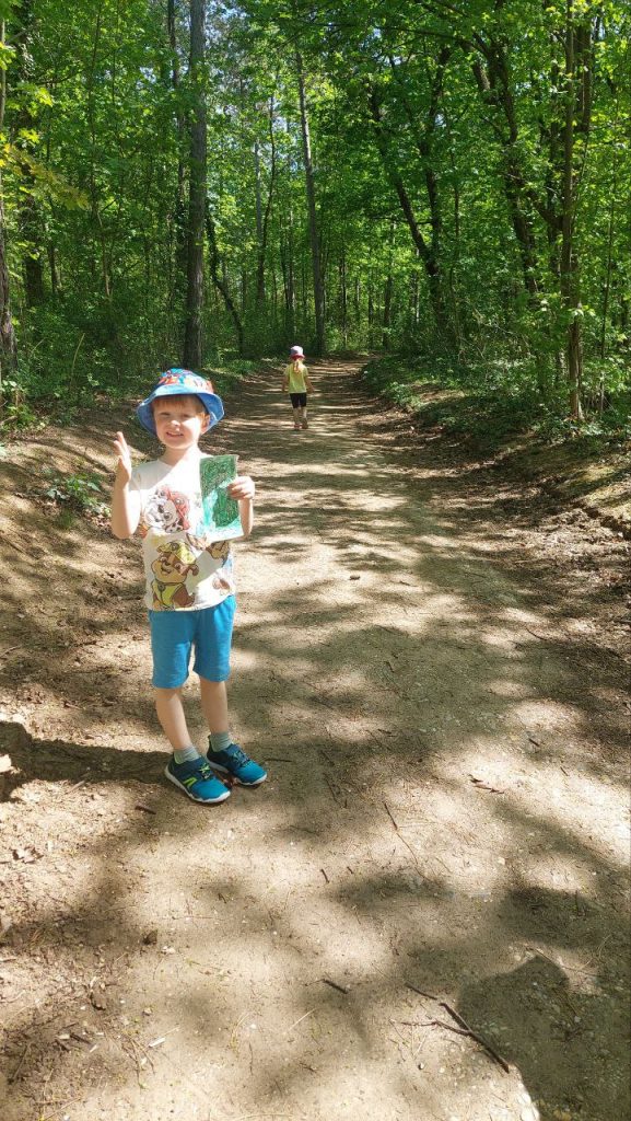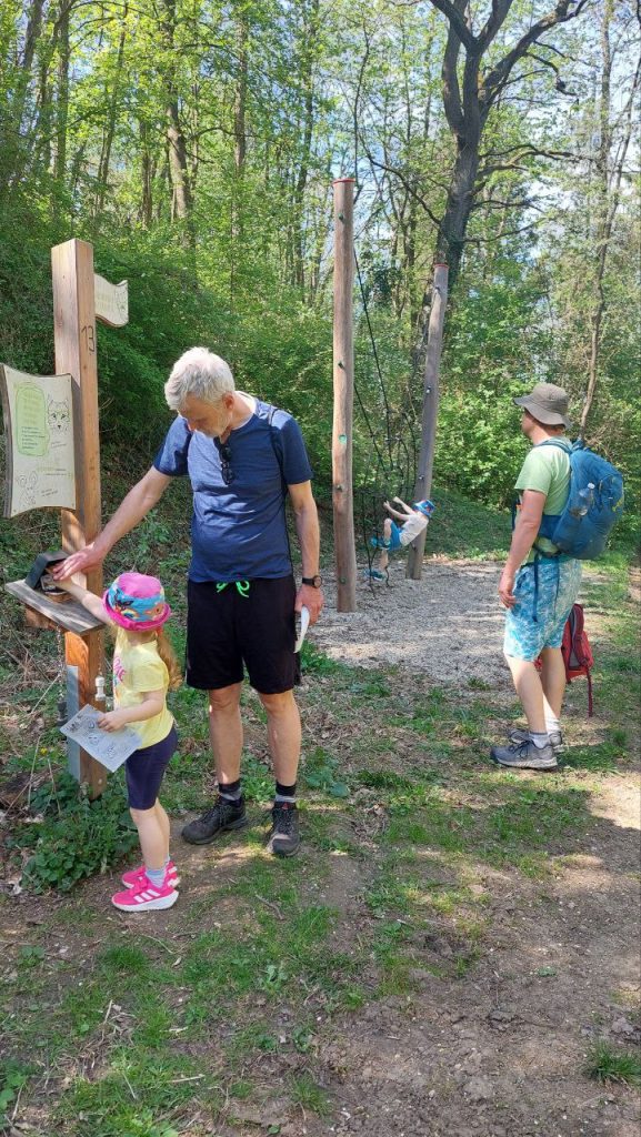 Postupem času jsem ale zjistila, že Motorikpark není jediné, co pro děti Hollabrun nabízí. Je tu i pěkná dětská stezka. Jedná se o kolečko v lese, kde hlavním cílem je rozhledna. Na stezce je spousta stanovišť, kde děti sbírají razítka, plní nějaké úkoly, o něčem z přírody se dozvědí. Na některých stavištích je i hřišťový prvek. Je dobré si dopředu vytisknout kartu na razítkování. Já to neudělala, na místě žádné k dispozici nebyly, u prvního stanoviště jsme marně lovili nějaký papír a nakonec nám ho darovali kolemjdoucí, co ho měli nepoužitý. Podrobnosti o stezce a i razítkovací kartu najdete zde (dá se to tam přepnout i do slovenštiny).