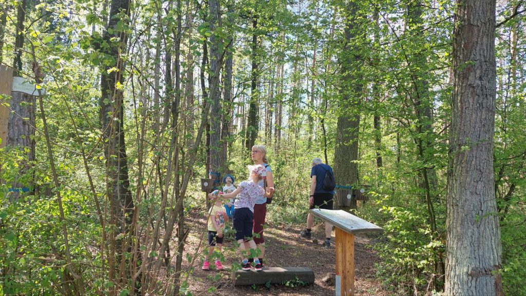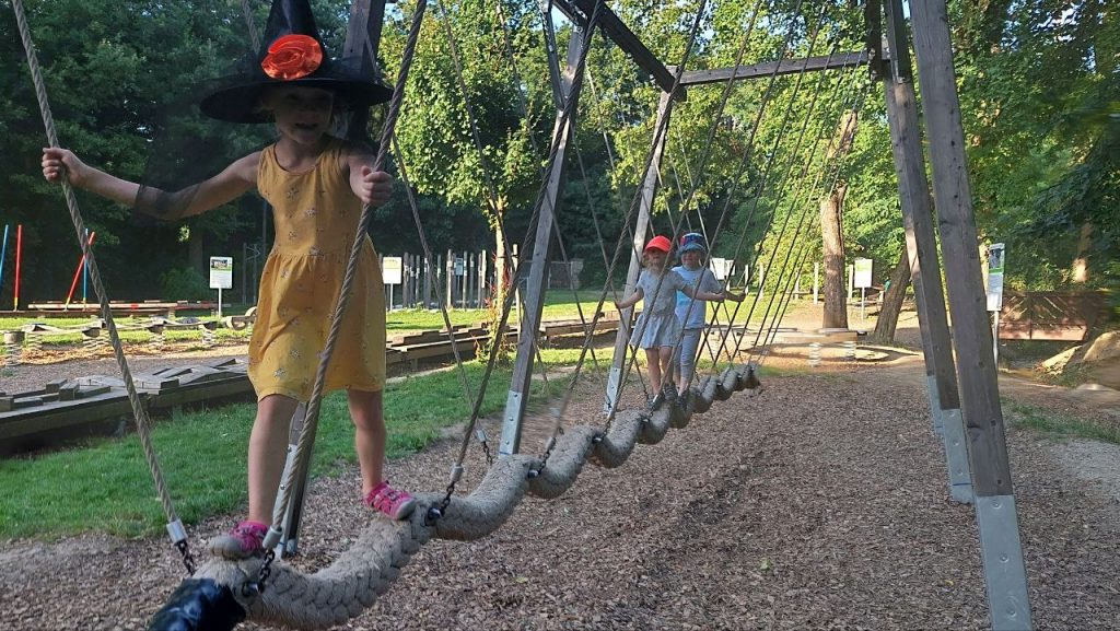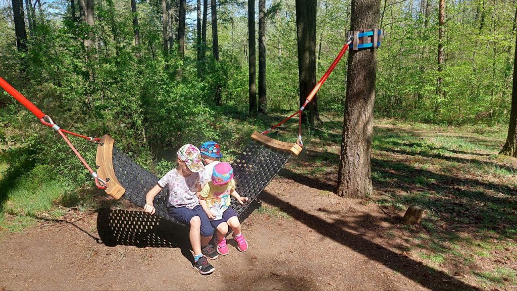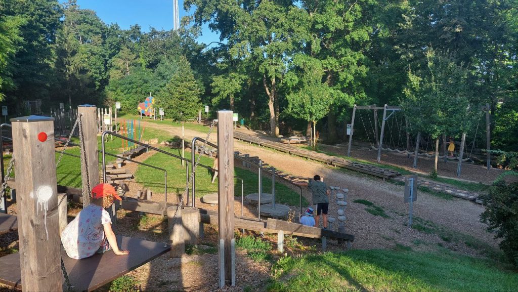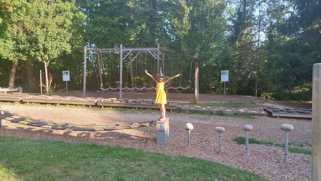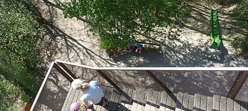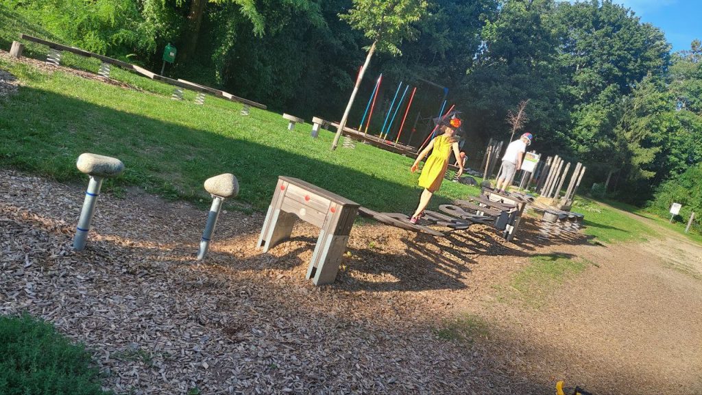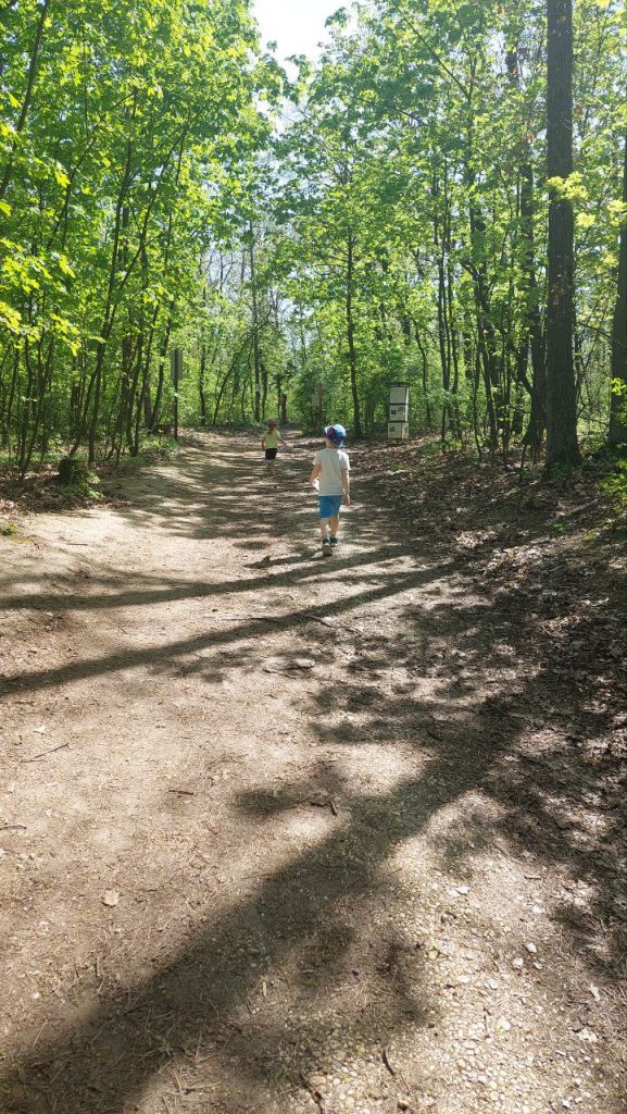 Zaparkovali jsme v uličce k lesu. Dá se parkovat i na tom parkovišti v lese. Parkování je zdarma. Stezka je poměrně dobře značená. Rozhledna je přístupná zdarma. Bohužel asi nemám žádnou fotku rozhledny, ale rozhodně je zajímavá. To hřiště na mapě v bodě 8 už není hřiště, ale celkově měly děti za den hřišť dostatek, když jsme se potom ještě vydali do Motorikparku. Trasa by se bez problému dala projít i s kočárkem nebo projet na kole (cyklistů jsme potkali několik).