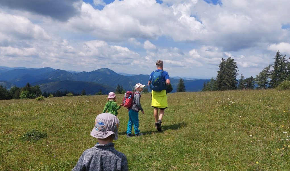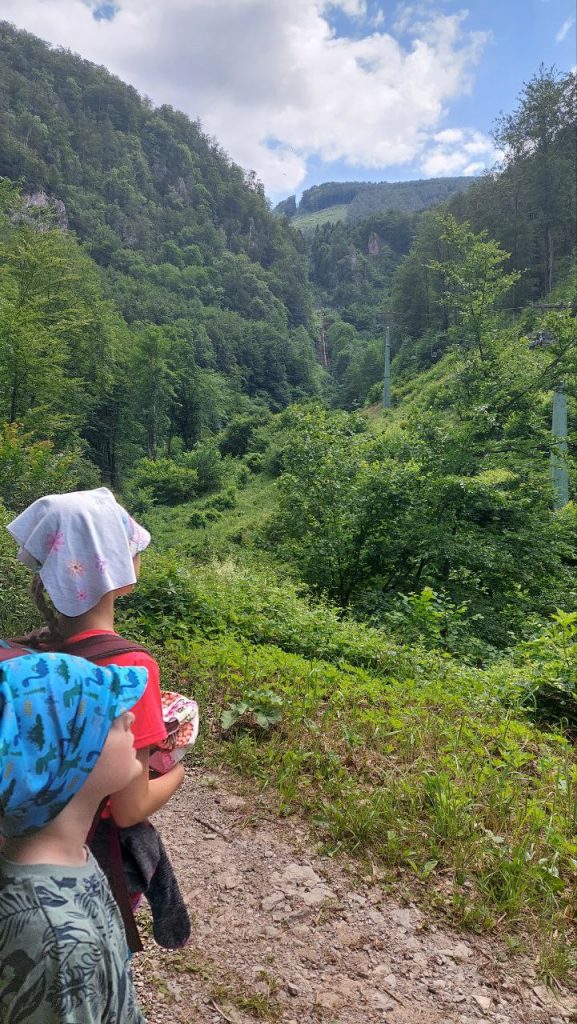 Muckenkogel je lanovka cca 2 hodiny autem od Břeclavi a my se sem v červnu vydali na jednodenní sobotní výlet. Koukla jsem, jaké lanovyky máme v NÖ card, a nějak moc předem neplánovala. No večer před výletem jsem zjistila, že se jedná k mému překvapení o jednosedačkovou lanovku. Zjistila jsem tedy, jestli osmiletá dcera tam může jezdit již sama, a další den jsme vyrazili. Osmiletá dcera cestu poprvé sama lanovkou zvládla suprově, ale teda na mě tahle lanovka moc nebyla. Vede totiž přes různé rokle a má celkem vysoké sloupy a to já moc nedávám. Petr navrhoval, že se budeme procházet někde na kopečku a pojedeme zase pak lanovkou dolů. Já si nedovedla představit, že tímhle ještě pojedu, tak jsme nechali děti pohrát na menším hřišti u horní stanice a pak jsme vyrazili dolů pěšky. Cesta je dost prudká, a i když jsme zvyklí chodit po kopcích, tak mě ještě 3 dny z toho sestupu bolely nohy. Ke konci jsme se rozdělili. Já pokračovala s dětmi po žlutočervené, jak je na mapě, a Petr se vydal sám po modré kolem vodopádů. U odbočky na modrou byla totiž cedule, že cesta je jenom pro zkušené chodce, nedoporučuje se za horšího počasí atd., tak jsme se tam radši netroufli malé děti vzít.