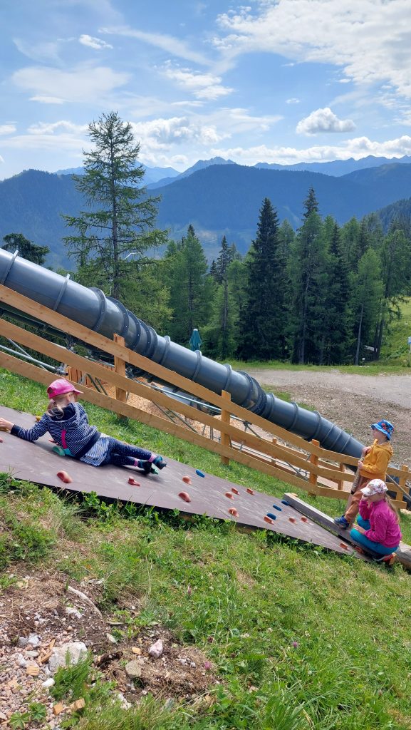 U horní stanice lanovky nejspíše letos vyrostlo nové hřiště s dlouhou zajímavou skluzavkou. Je tam trampolína a bagr a kousek pod lanovkou je hřiště pro menší děti.