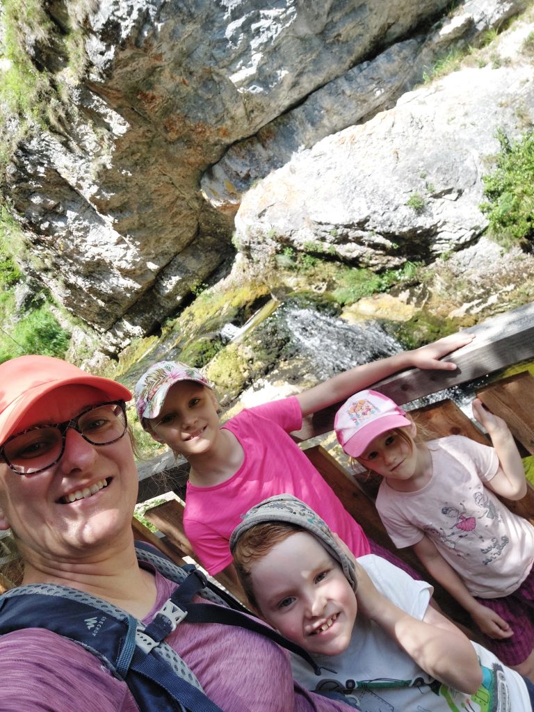 Na tento výlet jsme vyrazili i s dědou a nakonec jsme do cíle dorazili na tři skupiny – já s dětmi jsme prošli pouze cca dvě třetiny soutěsky a vraceli jsme se stejnou cestou zpátky – jednak to vypadalo, že se horší počasí (v soutěsce se nesmí být v bouřce) a jedno dítě se už bálo dopředu bouřky a dalším dvěma dětem se moc nelíbily schody ve výškách ke konci soutěsky. Ani mi nevadilo, že jsme nedošli na konec a s dětmi jsem se vracela, protože mně ty výšky taky nedělaly úplně dobře.