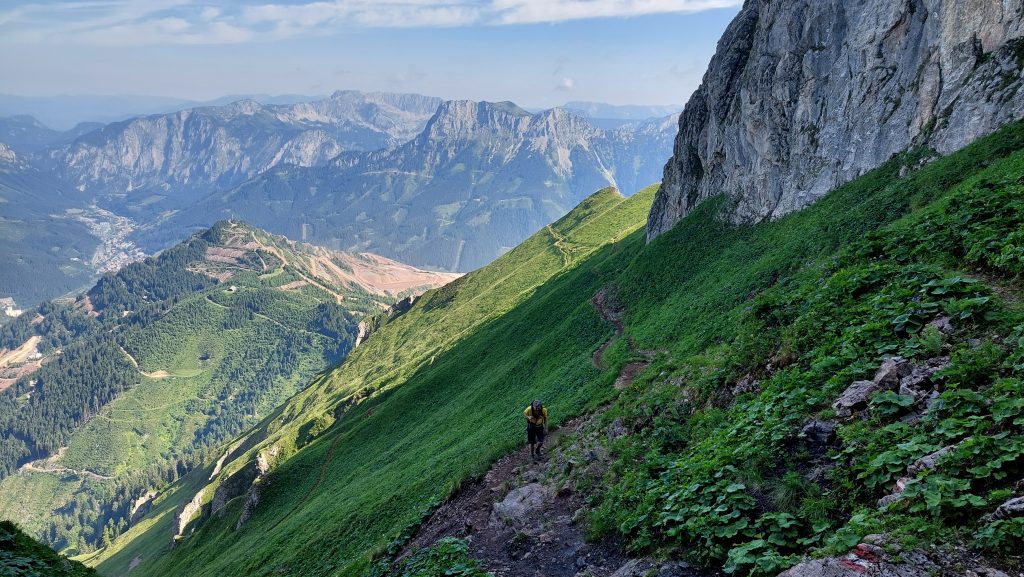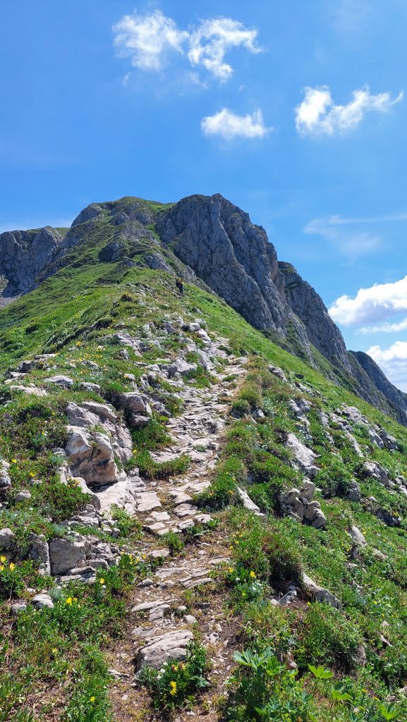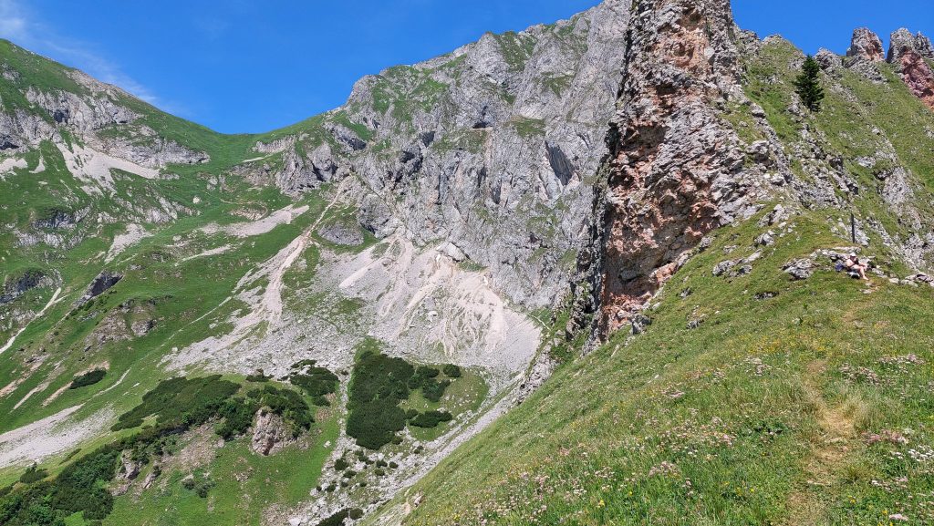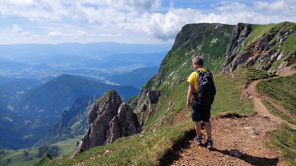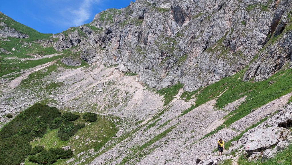 Cesta po hřebenu je takový odpočinek, ale jakmile se začne klesat, je to celkem náročný sestup. Dost nám při něm chyběly zapomenuté hůlky. Na fotkách to ani tolik nevypadá, ale sestup mi přišel náročnější než výstup a zabral nám opravdu hodně času. Většina lidí jde z Präbichlu stejnou cestou nahoru i dolů. Dolů přes Krumpensee jsme potkali jenom jednoho pána, co šel před námi.