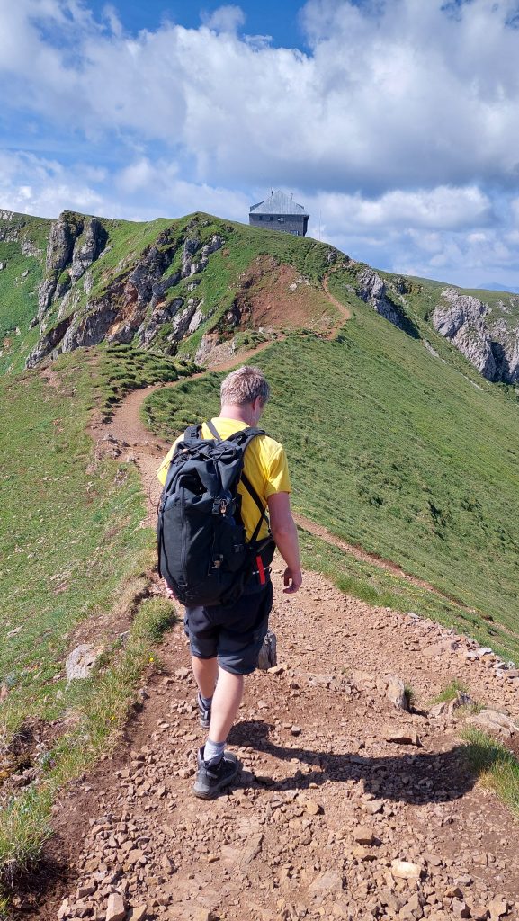 Na vrchol se dá jít dvěma různými cestami. Na jedné jsou ty schody, co tu jsou na fotkách. Na fotkách to zas tak nebezpečně a náročně nevypadá, ale děti a psy bych tam úplně nebrala. Místo se schody se dá lehce delší cestou obejít. Na vrcholu jsme byli něco po desáté. Stavili jsme se na chatě na polévku a pokračovali dál po hřebenu.