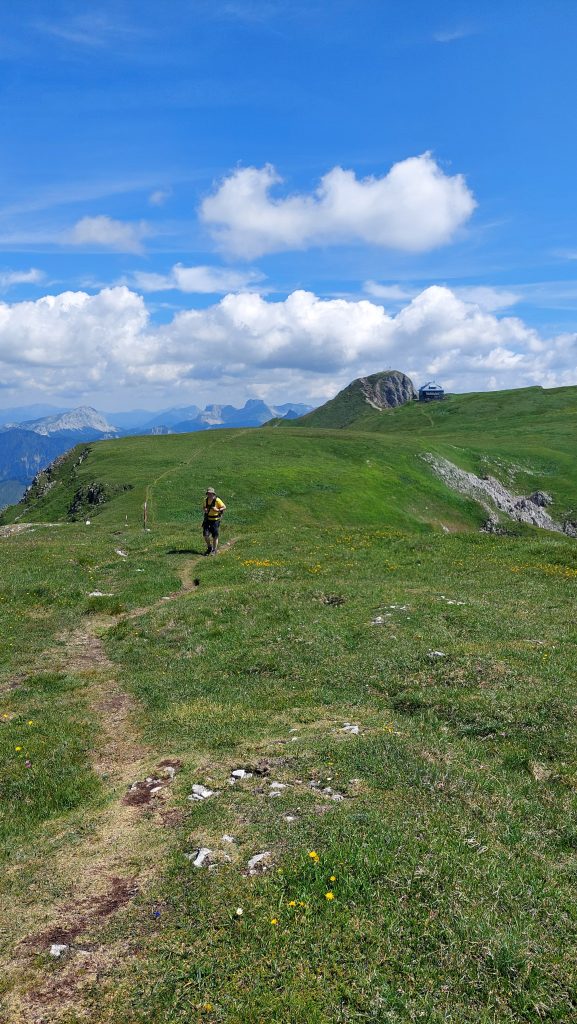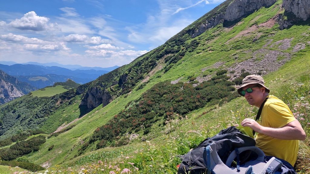 Nechali jsme se odvézt na parkoviště k Präbichlerhof (tam se dá i normálně parkovat), kde jsem teda při vystupování zjistila, že jsme zapomněli vzít hůlky. Chyba, docela by se hodily. Byl hodně teplý červencový den. Původní plán byl vyrazit už tak v šest, ale nakonec jsme vyráželi až v sedm, což bylo fakt pozdě. Chcípali jsme vedrem už cestou nahoru.
