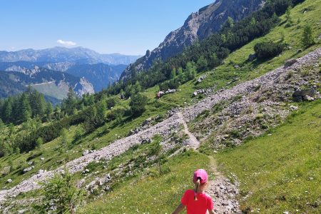 Procházek k Leopoldsteinersee jsme absolvovali už hodně, ale tentokrát jsme se rozhodli prozkoumat cestu nad Eisenerzem. Petr nás vysadil na začátku, jel zaparkovat k jezeru, vrátil se na kole, to nechal u autobusáku a potkal nás v bodě 2. Malá cestička se dětem opravdu líbila a výhledy tu jsou taky parádní. Tato cesta nebyla vhodná …